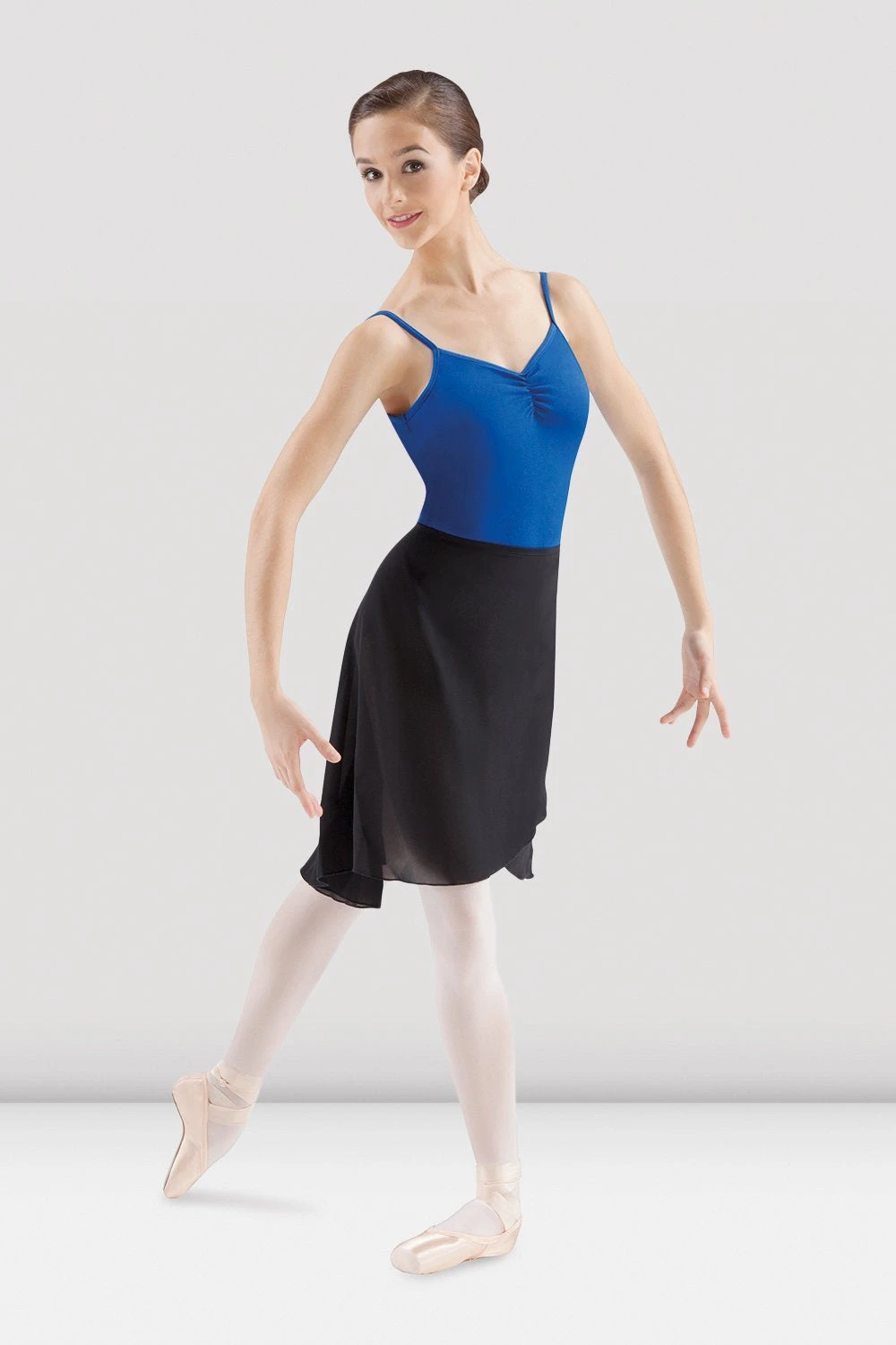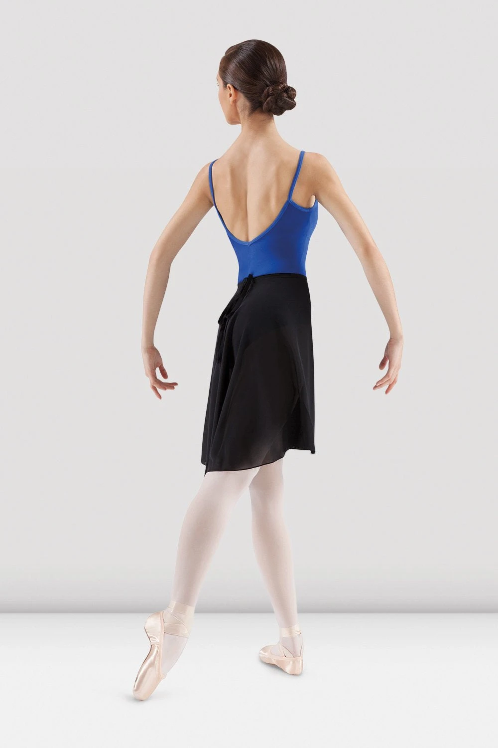 A classical style Georgette skirt which falls softly to the knee, crosses over at the front of the body and ties neatly at the back. This skirt is a beautiful length for teachers to wear to class, as well as students studying variations that require a longer length skirt for movement. Available in basic black, you can pair it with a black leotard or a different colour for a contrasting look.